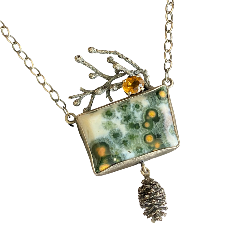 The initial artisans featured at Wild Hare Jewels were Peter and Judy Aylen. Nancy had been drawn to Peter’s distinctive design sense for years, having purchased dozens of pieces over the years. When approached by the Aylens to represent their work to sell the last pieces Peter made himself in Southwest Harbor (for over 40 years!), Nancy was humbled and excited at this request. At Wild Hare Jewels, we will have his work and several beaded pieces by Judy. She has a rare collection of vintage Bali beads that are almost impossible to source now. Each piece that she creates is thoughtfully laid out and unique.